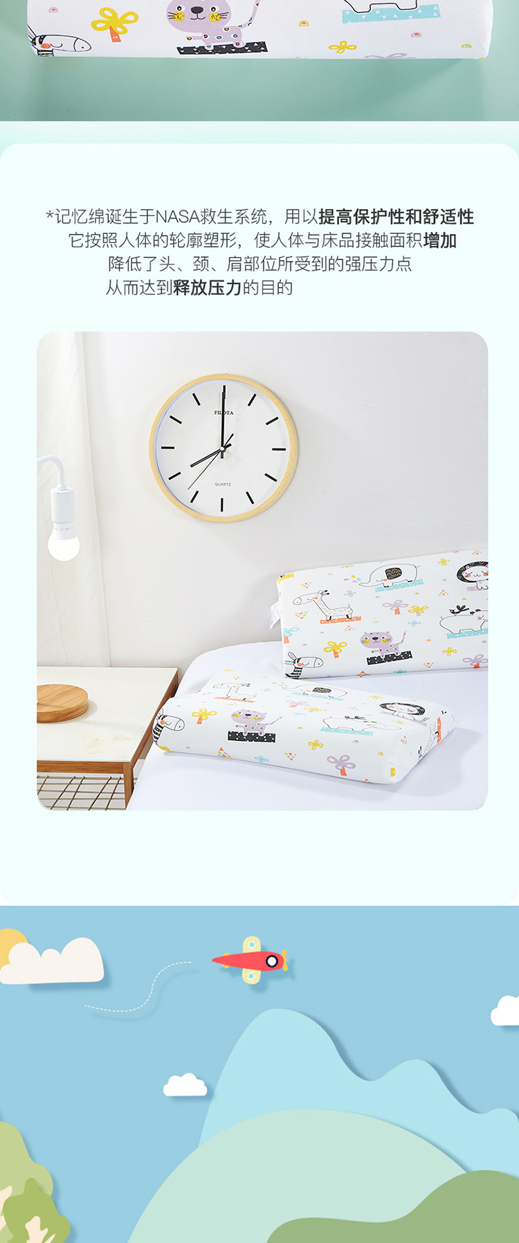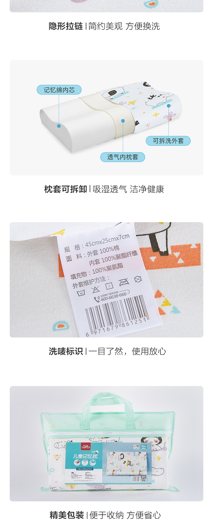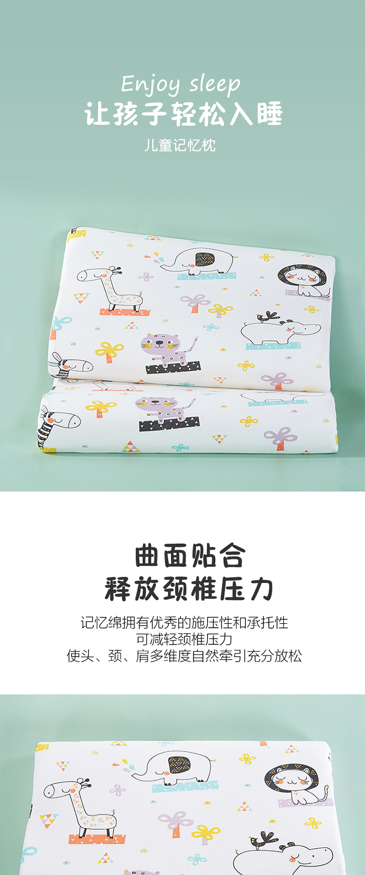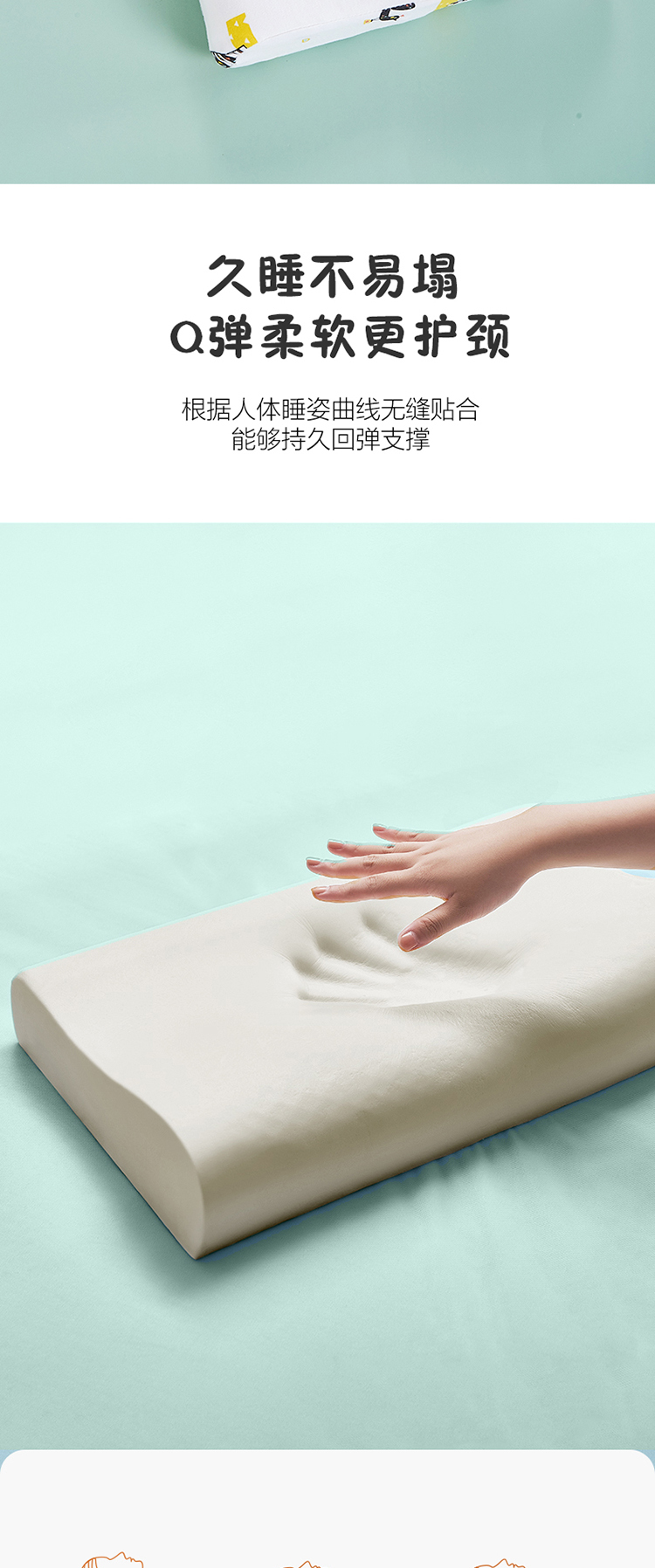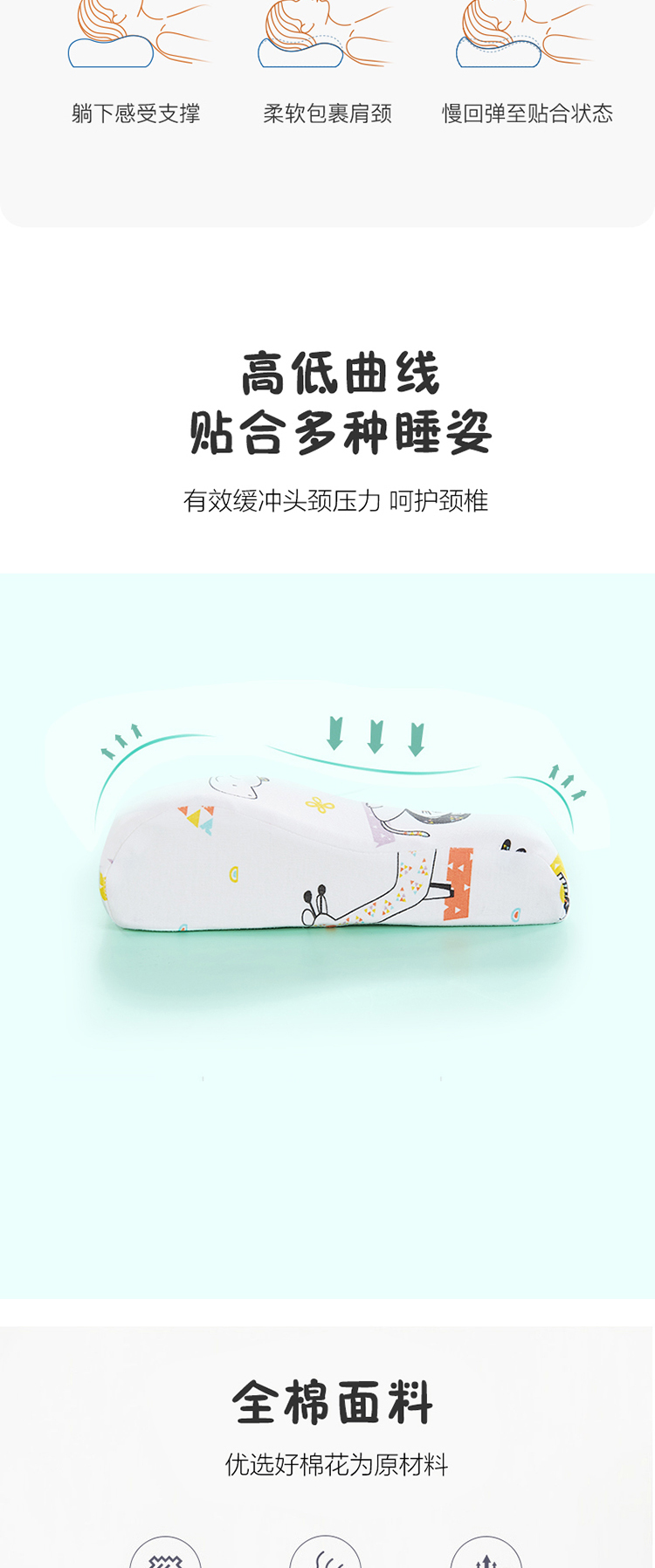 讓孩子輕松入睡,貼合肩頸,放松頸椎有效支撐,舒緩壓力,慢回彈久睡不易塌,全棉面料,柔軟細膩更親膚,舒適透氣,透氣更舒適。